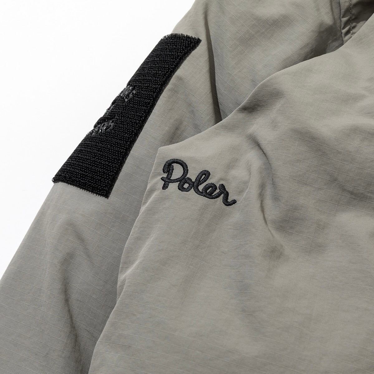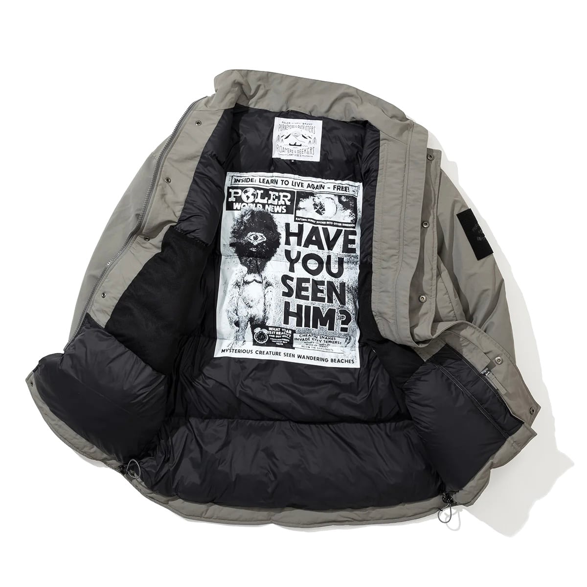 今また気分なモンスターパーカと呼ばれる米軍の防寒アウターをサンプリングした1着。表はさりげなく刺繍などをあしらいシンプルに仕上げつつ、内側にはユニークなグラフィックをあしらいPOLERらしくメイク。しかも、THERMOLITEの中綿で暖かさも抜群です。