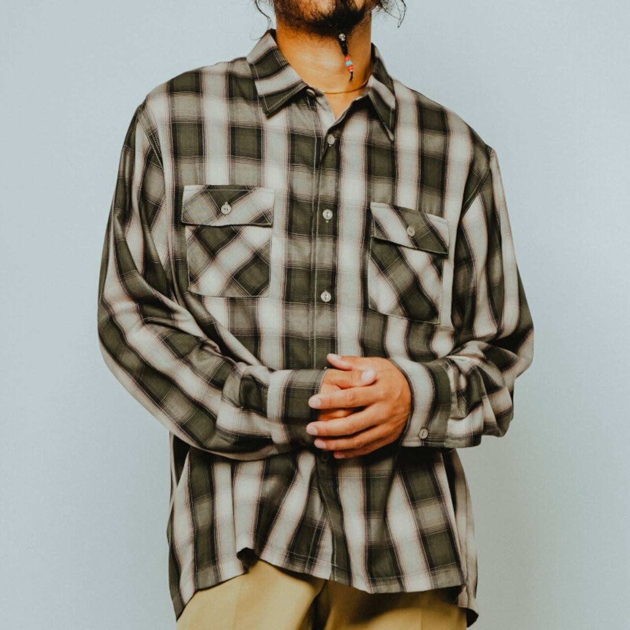 素材にはレーヨン混生地を使用。滑らかな肌触りと上品な落ち感を活かしつつ、オンブレチェックのパターンや色味は現代のスタイルに合わせてアップデートしました。BIGMIKEが得意とするヴィンテージワークシャツのエッセンスをベースに、今の気分で着られるフィットと仕様へと再構築。