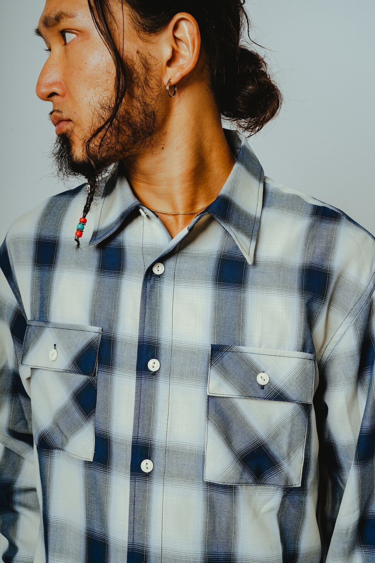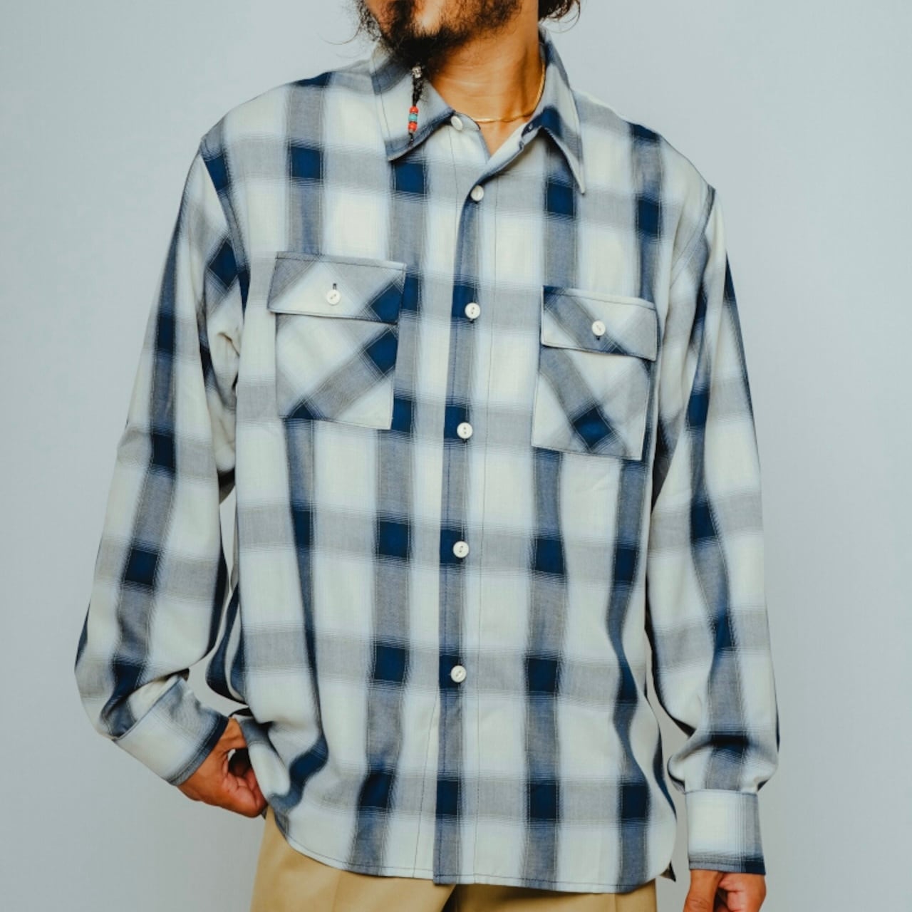 素材にはレーヨン混生地を使用。滑らかな肌触りと上品な落ち感を活かしつつ、オンブレチェックのパターンや色味は現代のスタイルに合わせてアップデートしました。BIGMIKEが得意とするヴィンテージワークシャツのエッセンスをベースに、今の気分で着られるフィットと仕様へと再構築。