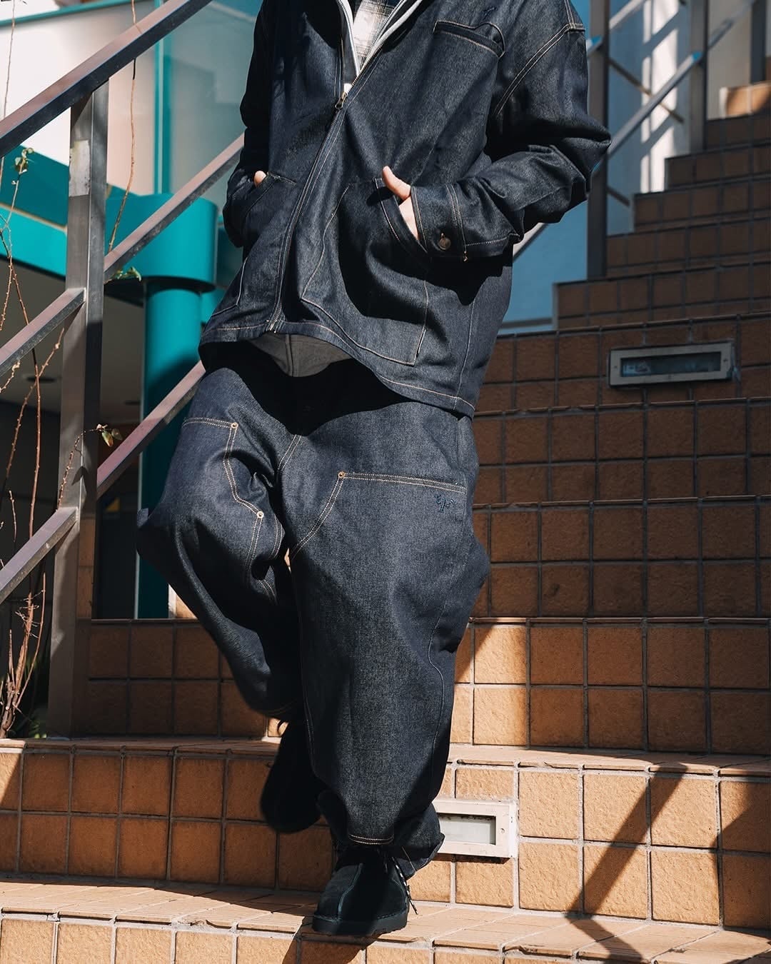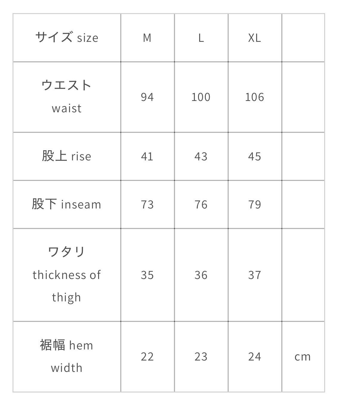 ウォッシュや防縮加工をしていない生デニムなので洗うと縮みます。それを踏まえて大きめに作っているのでいつものサイズ感でお選びください。最初のうちは色落ちもするので白いスニーカーやソックスはご注意ください。