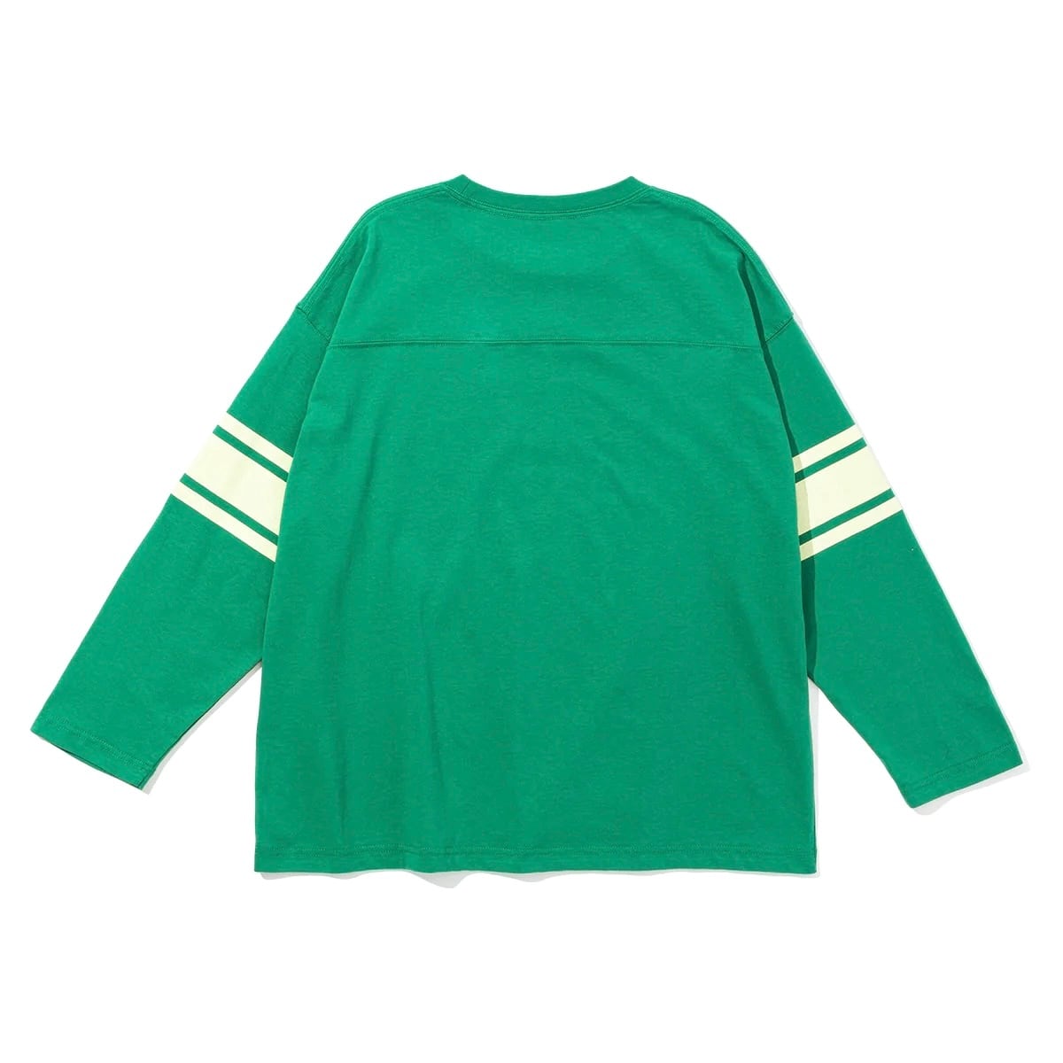 胸にチームロゴを彷彿とさせるプリントを落とし込んだフットボールシャツ。身頃はロゴと織りタグでシンプルに仕上げつつ、袖に太めのボーダーをあしらい緩急を付けてまとまりのある1枚に。スタイリングにちょっとアクティブさを演出したい時にオススメ。