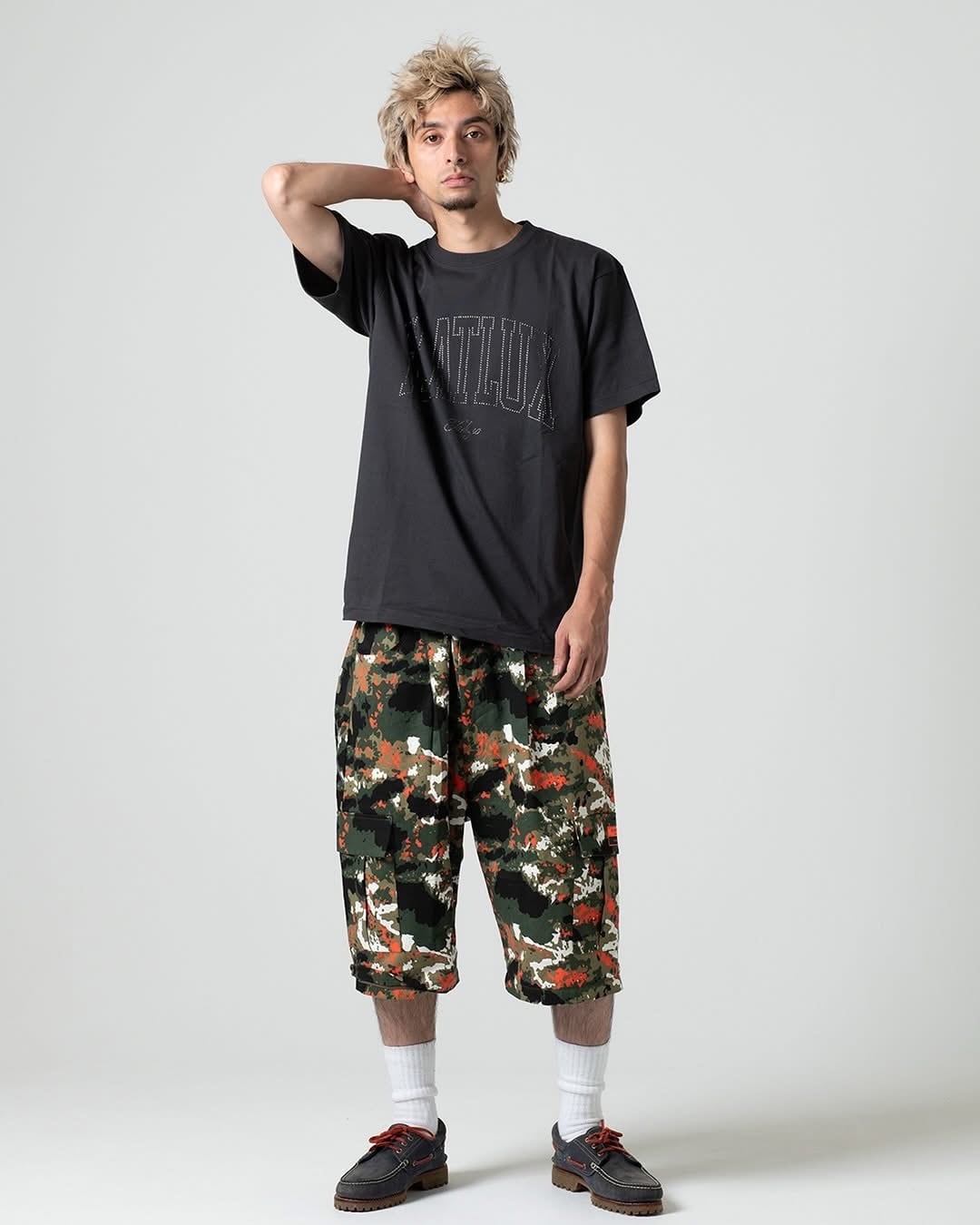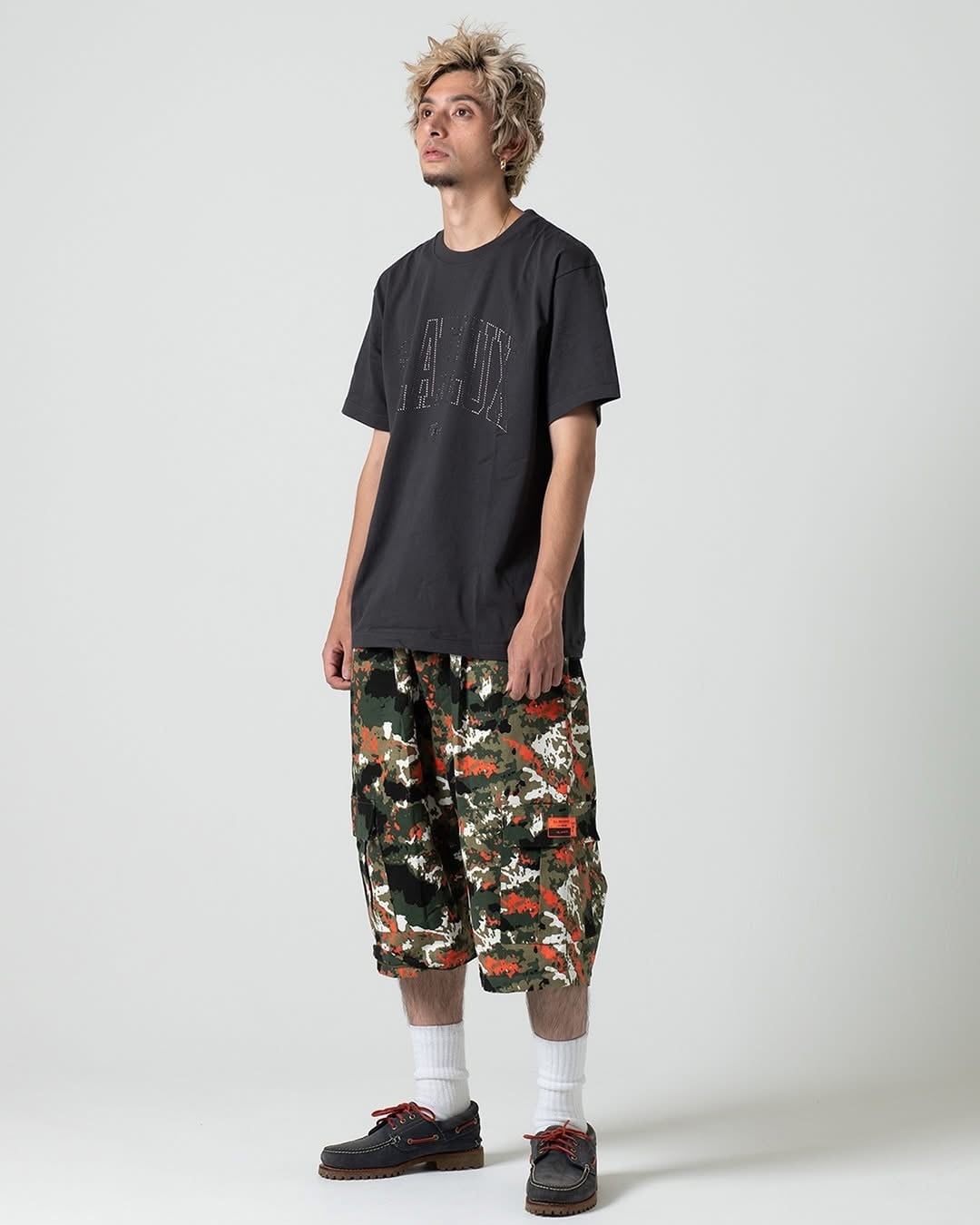 ヒップのリフレクターパイピングが特徴のTetsuo Cargo Pantですが、今回は迷彩をフィーチャー。足のシルエットを改良してもっと良い形になりました。さらにファスナーを取れば膝下丈のショーツに変身。