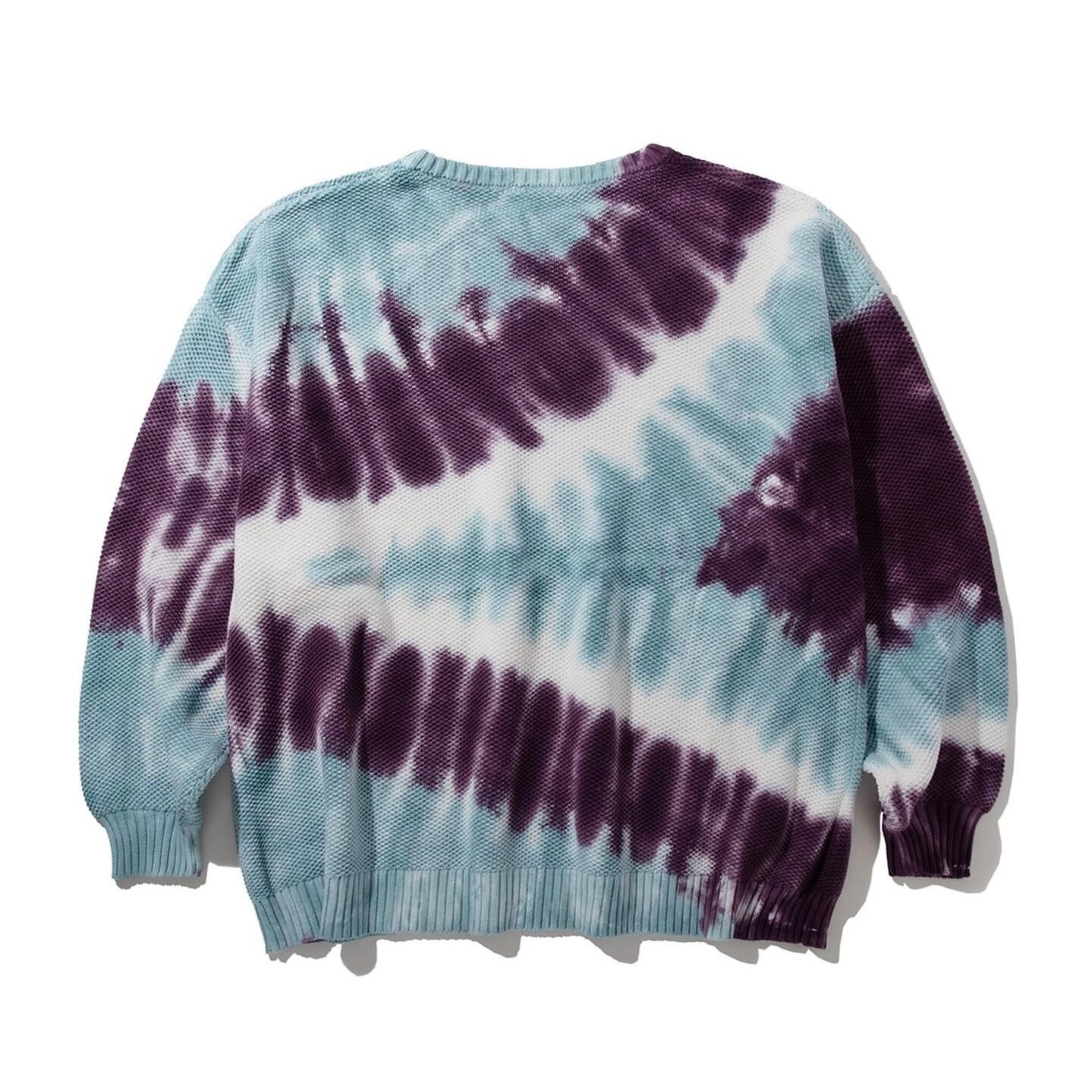 期待以上の仕上がりに、サンプルが届いた瞬間 ”うぉっ!”と声が出てしまった一品。綿100%の鹿の子編みニットを染め上げた、タイダイニット。巨大アームホールと落ちた肩、いつものゆったりシルエットでストレスフリーな着心地。綿なので暑すぎず、中に着るものをTシャツからサーマルやヒートテックなど調整すれば今時期から春までかなり長い期間着れます。